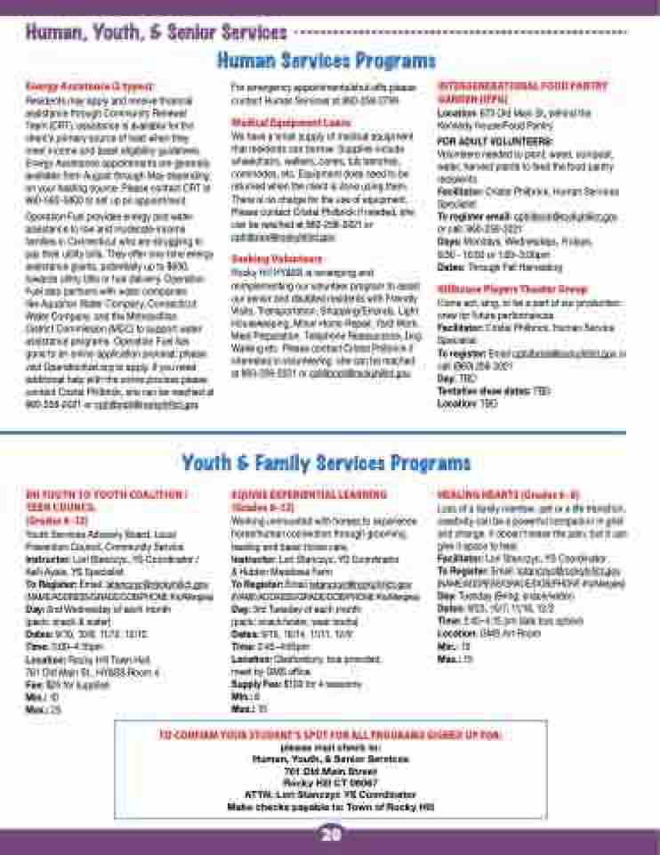Rocky Hill HY&SS is revamping and reimplementing our volunteer program to assist our senior and disabled residents with Friendly Visits, Transportation, Shopping/Errands, Light Housekeeping, Minor Home Repair, Yard Work, Meal Preparation, Telephone Reassurance, Dog Walking etc. Please contact Cristal Philbrick if interested in volunteering, she can be reached at 860-258-2021 or cphilbrick@rockyhillct.gov