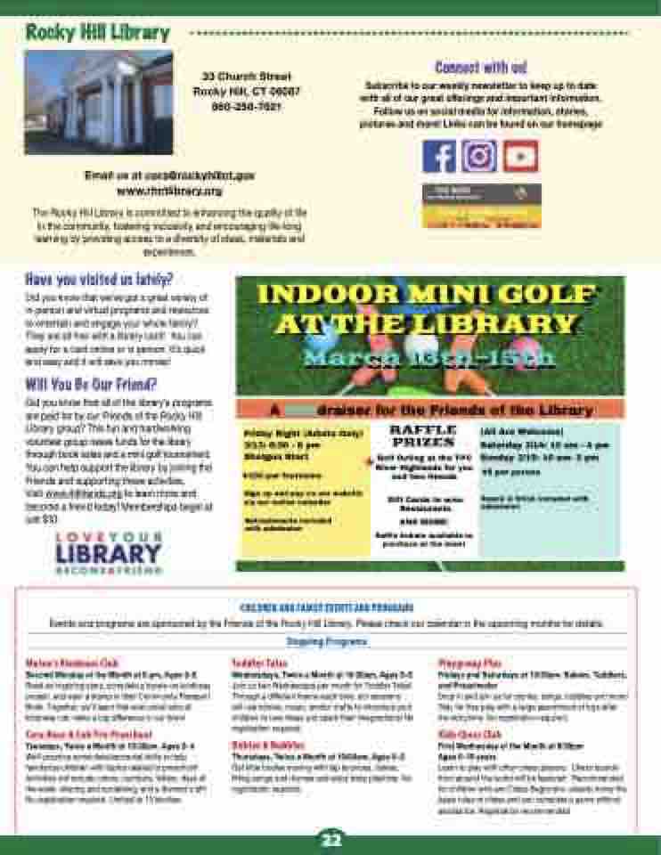 Did you know that all of the library’s programs are paid for by our Friends of the Rocky Hill Library group? This fun and hardworking volunteer group raises funds for the library through book sales and a mini golf tournament. You can help support the library by joining the Friends and supporting these activities.