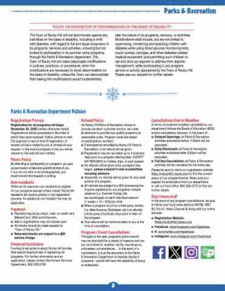 The Town of Rocky Hill will not discriminate against any individual on the basis of disability, including a child with diabetes, with regard to full and equal enjoyment of its programs, services and activities, including but not limited to participation in its summer camp programs through the Parks & Recreation department. The